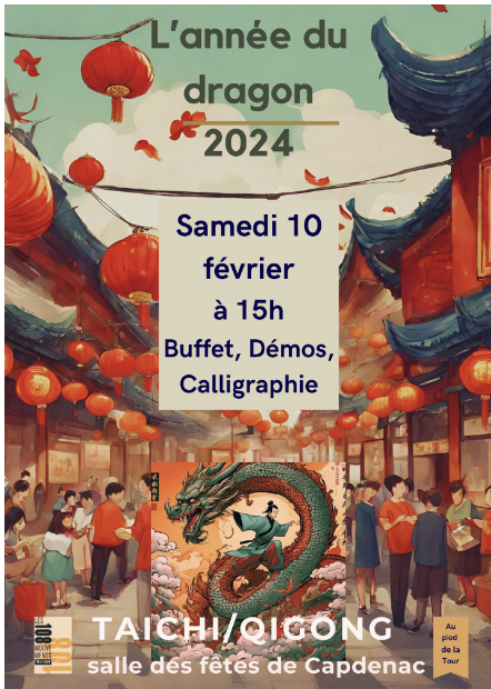 Le samedi 10 février 2024, nous organisons conjointement avec l’association ‘Au Pied de la Tour » la fête du Nouvel An Chinois à CAPDENAC LE HAUT. Cette année c’est l’année du Dragon que nous célèbrerons avec démonstrations, vin chaud, buffet concocté par les élèves de Taichi et de Qi Gong,…..